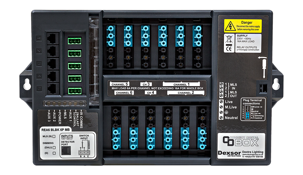 Programmable lighting control module (LCM), 12 way luminaire connection centre with 5 separate sockets for connecting Reacta 6 sensors. Luminaires are connected using 6 pole black/grey locking connection leads whilst the sensors are connected using CAT5 RJ45 leads. 5 x Hard-wired switch inputs. Locking leads provide additional electrical connection reliability. 6 Pole pre-wired luminaire leads or 6 pole male plugs are available separately.