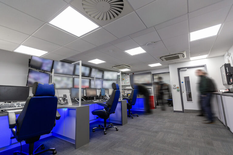 In the CCTV control room, where staff work around the clock with no access to natural daylight, Dextra designed and supplied a fully automated human-centric lighting system. This included MOD UGR fittings with white tunable drivers, following a circadian rhythm control system that automatically adjusts colour temperature throughout the day. The system comprised a 910 digidim router, a scene plate for manual override and 321 multi-sensors for absence detection, helping to improve comfort and wellbeing for shift-working staff.