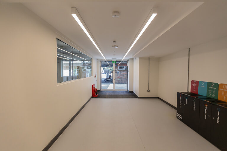 For the main building refurbishment, Dextra provided a full DALI-controlled system with all emergency luminaires being LS3. The luminaires were also supplied in different colour temperatures to suit various areas. In spaces with exposed services and no ceiling, the Comtec Surface luminaire was installed, while standalone LED4 fittings were used to meet the university’s emergency lighting strategy.