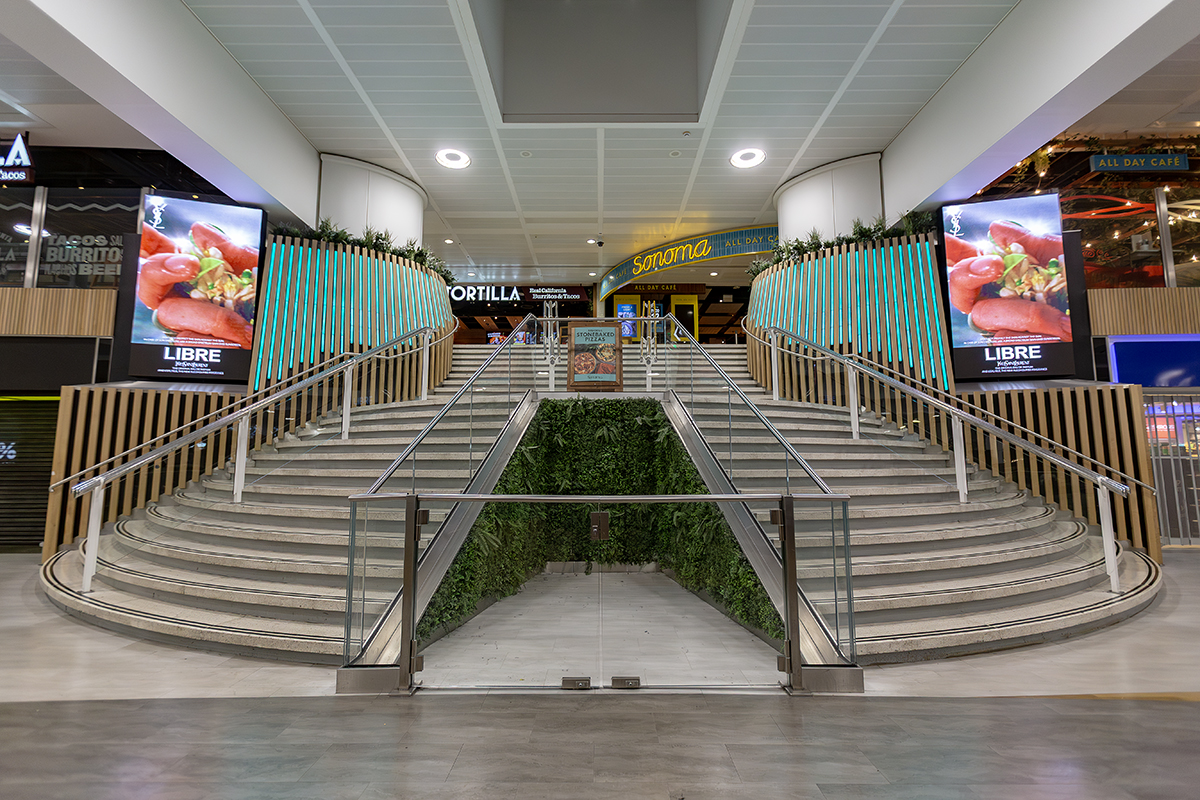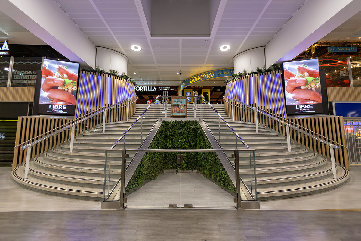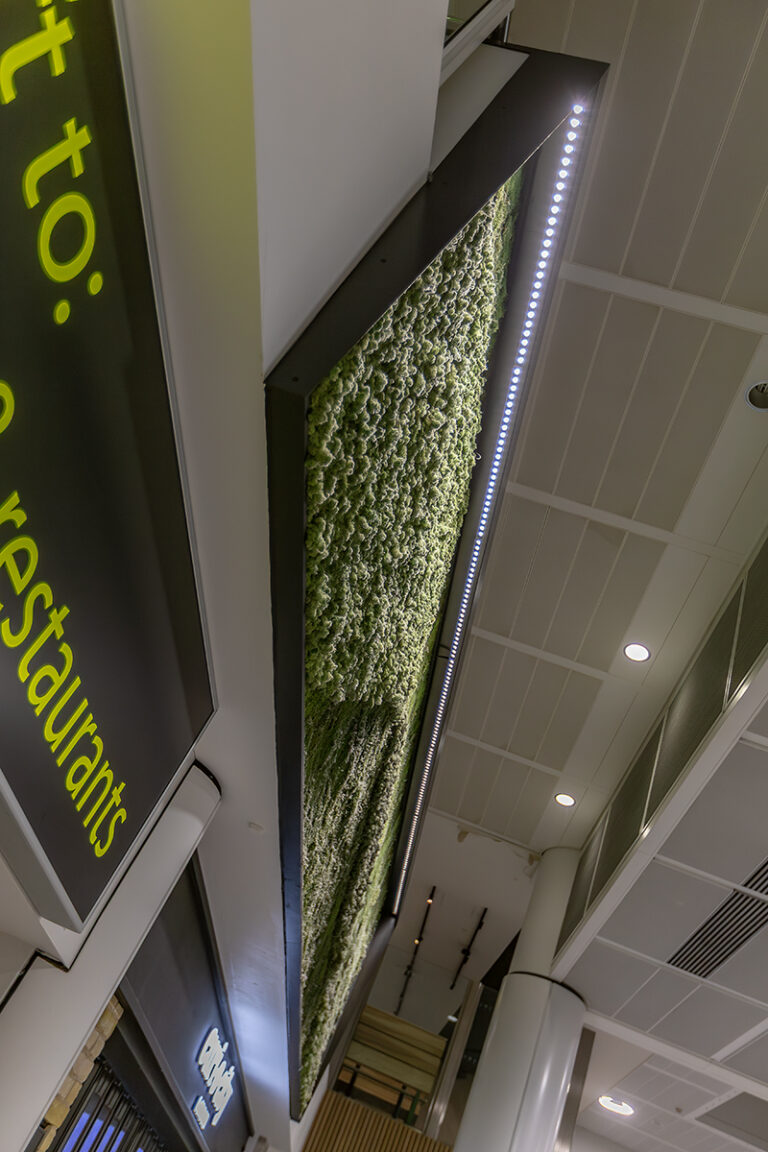 In addition to the stair and escalator features, LEDextra’s Glide Mini was installed as a wall-grazing solution to highlight the retail “Moss Walls” within the concourse.