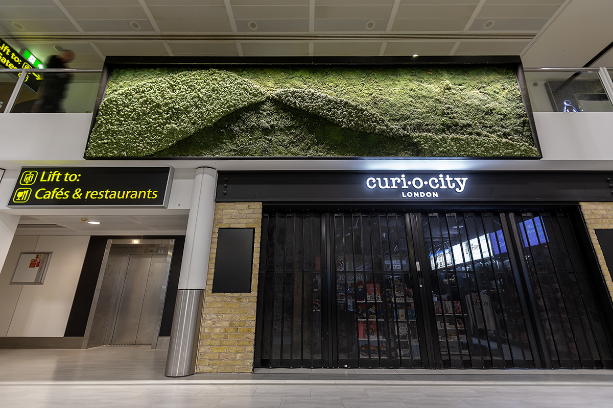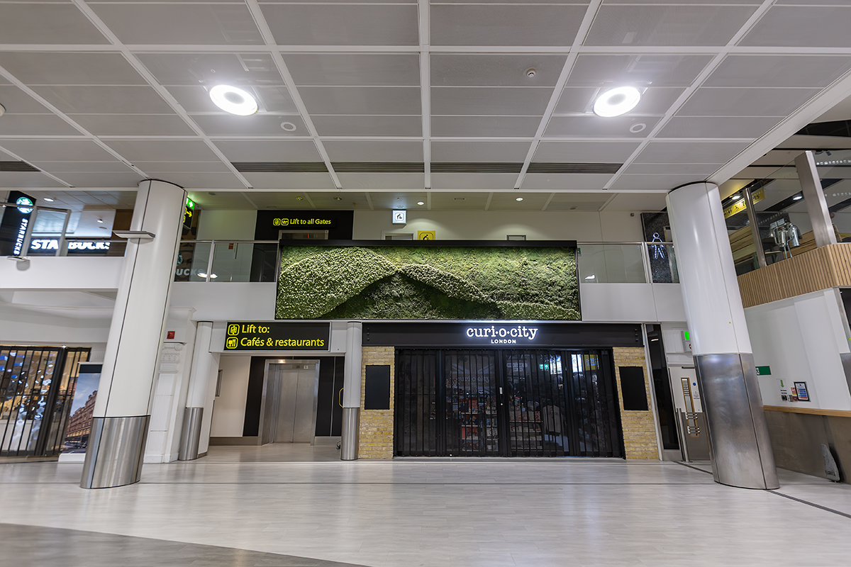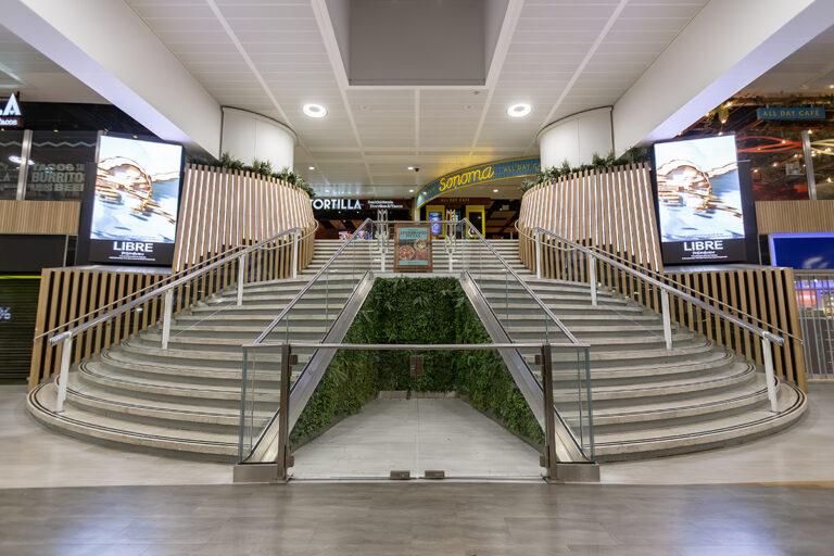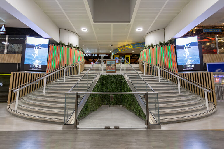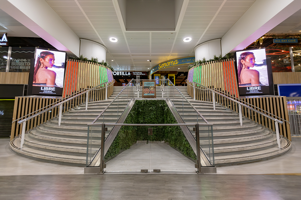 In addition to the stair and escalator features, LEDextra’s Glide Mini was installed as a wall-grazing solution to highlight the retail “Moss Walls” within the concourse.