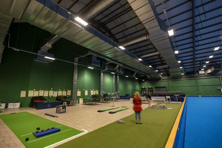In the activities and indoor bowls area, the Prosport was installed. The Prosport is IK10 rated and manufactured with a steel housing, injection moulded polycarbonate end caps and a curved clear polycarbonate diffuser.