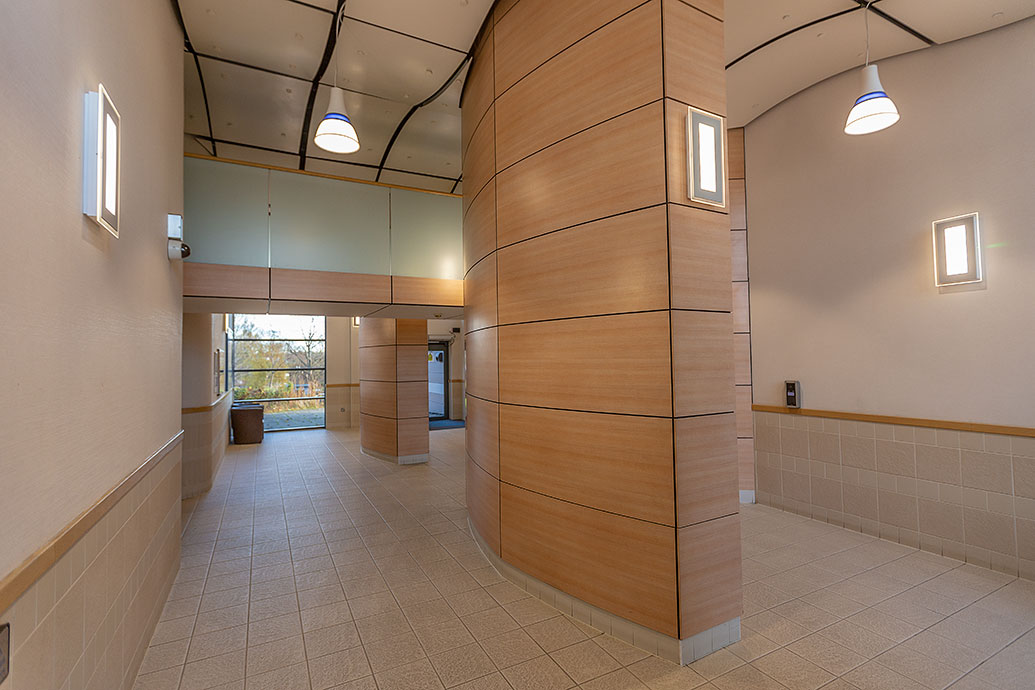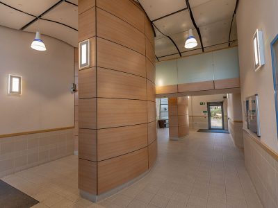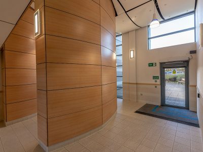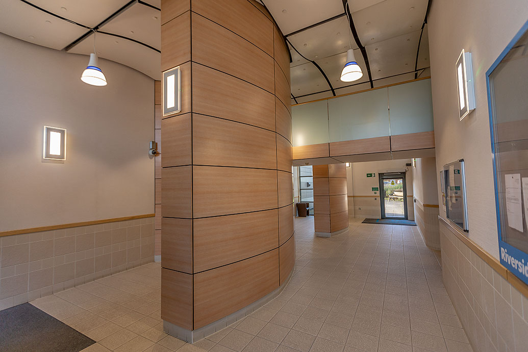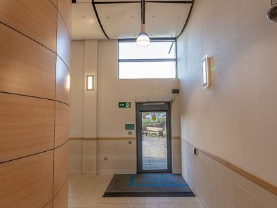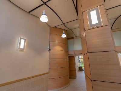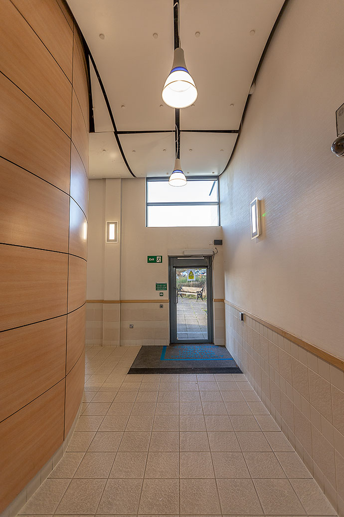 In the entrance lobby, 10 Volito’s were fitted to enhance the style and improve the performance of lighting in the area. Dextra’s Volito combines efficiency and flexibility with a striking aesthetic, the Volito offers the ideal solution to those wishing to create drama and impact in any space. With a milled clear surround with bevelled edge the Volito produces a halo effect which contrasts against the grey housing and high transmission central opal diffuser to produce concentric contrasting rings with differing visual effects.