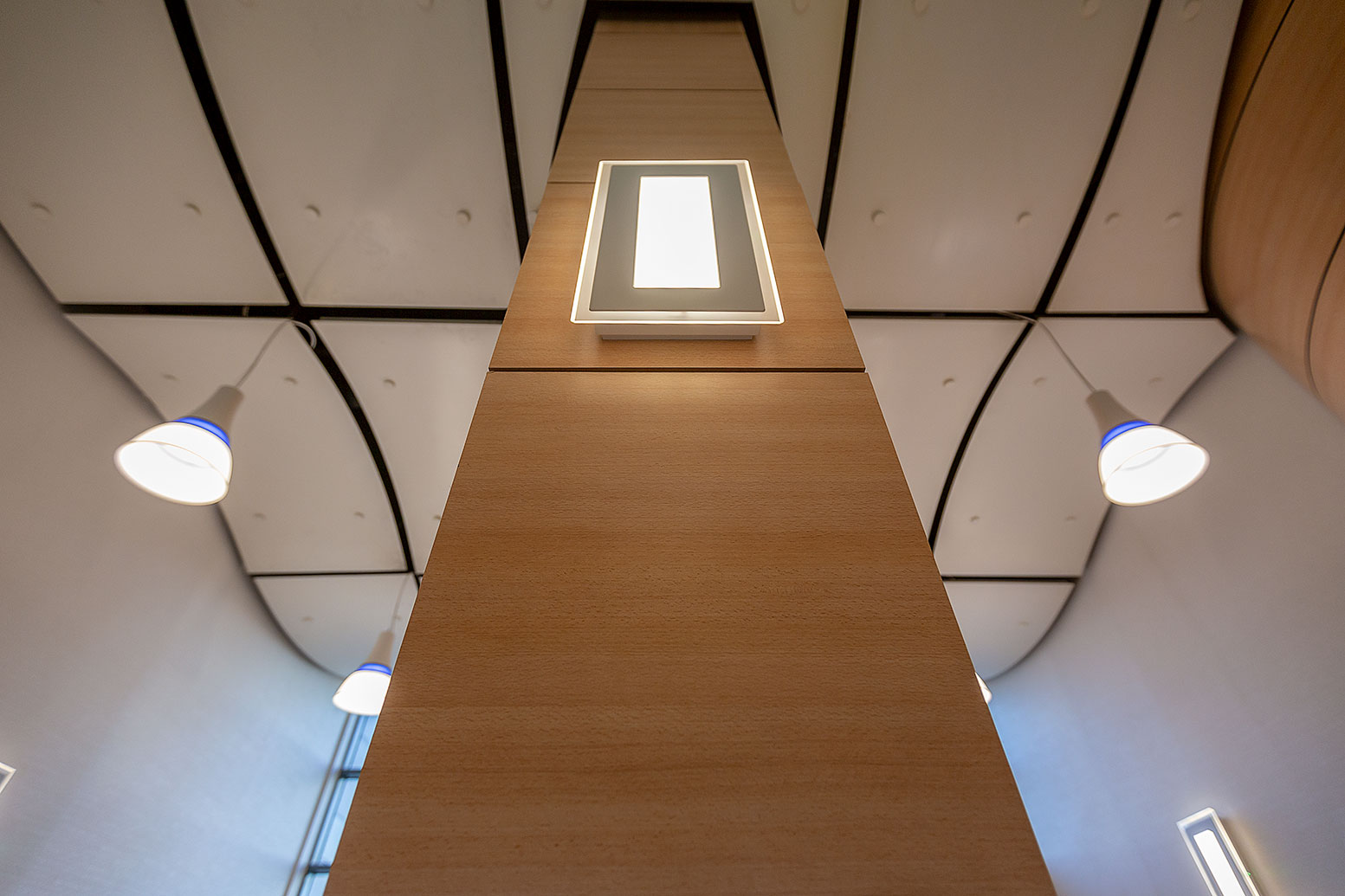 Also fitted in the entrance lobby were eight Capo LED’s which were fitted with a blue collar. The Capo LED combines efficiency and performance in an architectural lighting solution in suspended applications for both ambient and accent lighting. With anodised spun rear housing, translucent collar available in a range of colours and opal refractor the Capo provides a decorative and attractive installation that can also be tailored to suit any corporate theme.